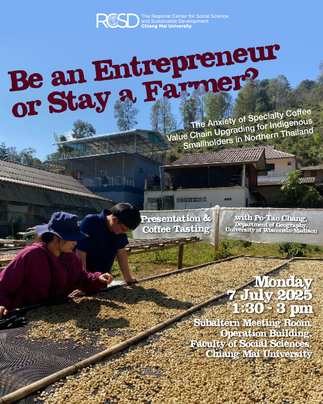 This presentation is designed for people who are interested in topics related to sustainable agriculture, indigenous peoples, coffee commodity chains, and industry in Thailand. Po-Tao Chang will present his latest research findings about the transformation of highland Arabica coffee production with (mostly) Akha people, and the revolution of the Thai (specialty) coffee industry. Briefly speaking, the Akha people have played a crucial role in expanding and upgrading both the quantity and quality of Arabica coffee production over the past two decades. There has been a dramatic number of Akha coffee producers elevating the quality and value of their coffee parchments and green beans. While some of them are becoming entrepreneurs, the uneven development of coffee production is also happening among different ethnic groups and villages. In addition, the anxiety of massive investment and the uncertainty of market transformation have also been emerging challenges for indigenous coffee smallholders in northern Thailand.