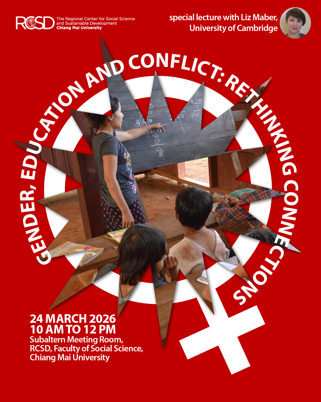 RCSD invites all to join a special lecture “Gender, Education and Conflict – Rethinking Connections” with Liz Maber on Tuesday, 24 March 2026 from 10 am to noon at the Subaltern Meeting Room, Faculty of Social Sciences, Chiang Mai University.