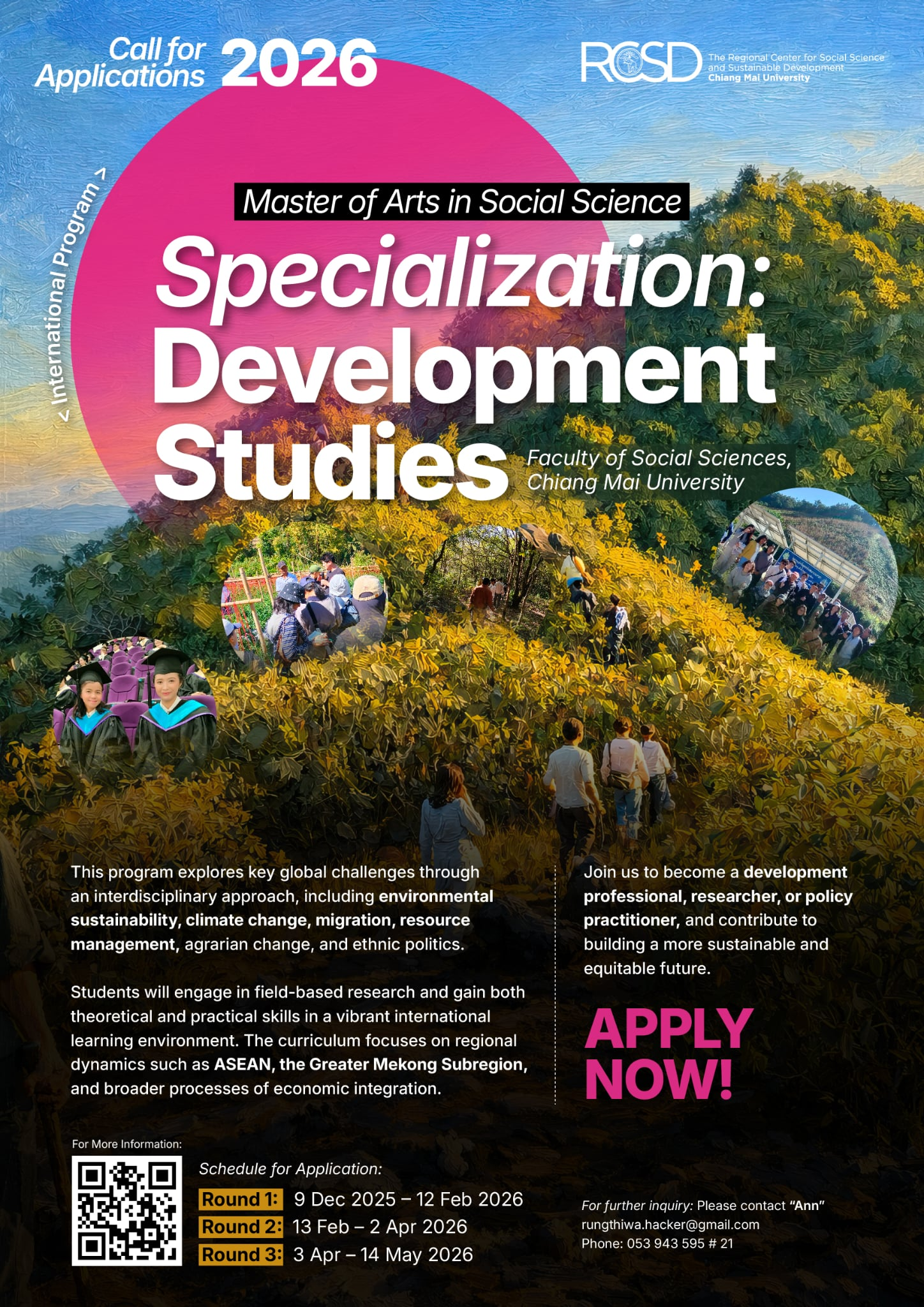 The international master’s program in social science (development studies) offered by the Department of Social Science and Development, Faculty of Social Sciences, Chiang Mai University is open for applications! This program explores key global challenges through an interdisciplinary approach, including environmental sustainability, climate change, migration, resource management, agrarian change, and ethnic politics.