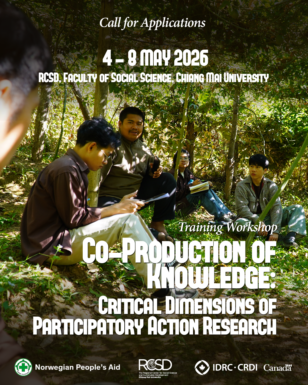 The Regional Center for Social Science and Sustainable Development (RCSD), Faculty of Social Sciences, Chiang Mai University, with the support of the International Development Research Centre (IDRC) and Norwegian People’s Aid (NPA) invites graduate students, early-career scholars, journalists, and development practitioners to apply for a 5-day training workshop titled: “ Co-Production of Knowledge: Critical Dimensions of Participatory Action Research.”